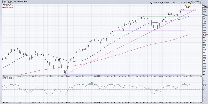 Friday’s session, which initially showed a strong upside reaction after the release of the latest data for the Fed’s favorite measure of inflation, ended up showing weakness as the S&P failed to close above the 5500 level. We remain constructive on the SPX as long as it remains above our “line in the sand” of 5400, which lines up well with trendline support using the major market lows back to October 2023.