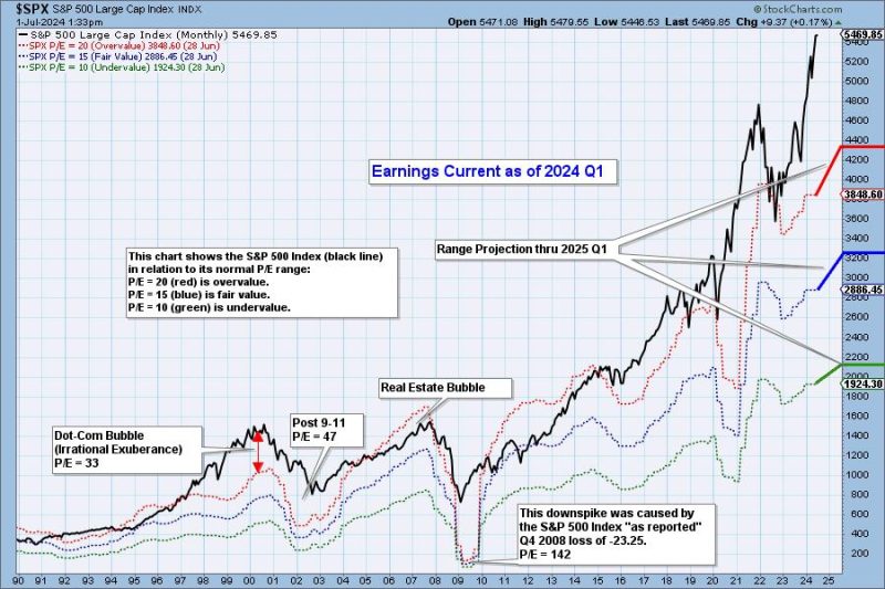 The following chart shows the normal value range of the S&P 500 Index, indicating where the S&P 500 would have to be in order to have an overvalued P/E of 20 (red line), a fairly valued P/E of 15 (blue line), or an undervalued P/E of 10 (green line). Annotations on the right side of the chart show where the range is projected to be, based upon earnings estimates through 2025 Q1.